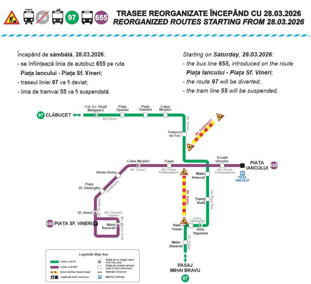 Transportul public din București va suferi modificări importante începând de sâmbătă, 28 martie, ca urmare a lucrărilor de reabilitare a liniei de tramvai de pe Strada Traian. Autoritățile anunță suspendarea unor linii, modificarea traseelor existente și introducerea unor rute suplimentare pentru a compensa impactul lucrărilor.